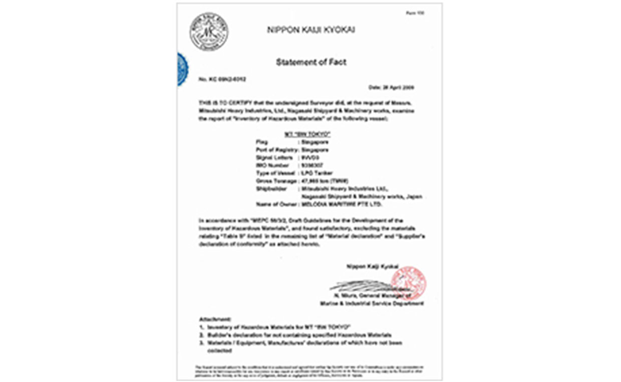 The Meiji Shipping Group built its first B.W. TOKYO LPG very large gas carrier in 2009 in anticipation of the Ship Recycling Convention* set to go into effect in the next several years. This ship is the first NK class vessel to issue an inventory of hazardous materials (IHM), which identifies the amount and location of hazardous materials onboard the ship, and receive a ship recycling license. As the shipbuilders, Mitsubishi Heavy Industries and ClassNK launched teams to issue this inventory and comply with the Ship Recycling Convention. The two teams worked together and put in place a comprehensive system to satisfy our requirements for this vessel in the first initiative to build a ship of this kind in Japan.