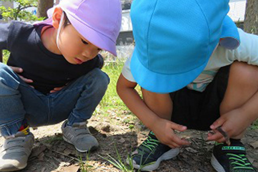 The Kujira Nursery School plants and harvests fruits and vegetables as part of its nutritional education to teach the children about eating habits for a healthy body and mind. This activity to cultivate familiar foods heightens an awareness and interest in food. Children come to enjoy food and learn the importance of life as well as gain a sense of gratitude for the people who deliver this food to their table.