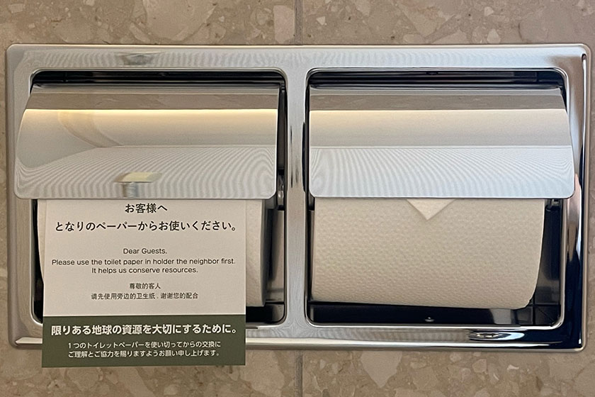 客室では、ルーム清掃が不要な場合にお知らせいただくための「エコサイン」を導入し、備品等の新品の使用削減につなげています。また、トイレットペーパーのホルダーに節約メッセージが書かれたカードを配置し、紙資源を大切にご利用いただくよう呼びかけています。